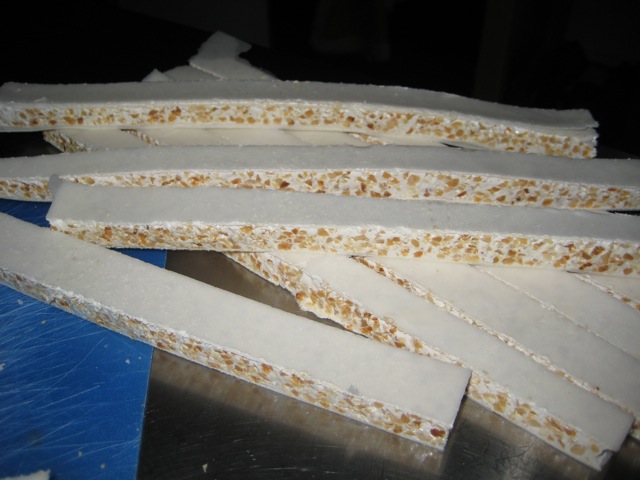 sieht sehr verlockend aus. erinnert an terrazzo und hochzeiten in den fünfziger jahren. mandelsplitter, florntiner und nougat von montelimar oder türkischer honig sind das lieblingsnaschwerk meiner mutter. ich sollte sie unbedingt auf selbstherstellung anfixen.