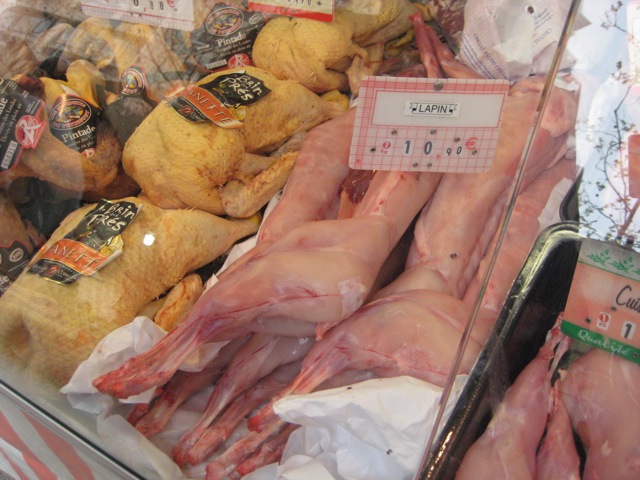 Auf den Märkten spiegelt sich die Liebe dieses Landes zu gutem Essen wider. Sag ich jetzt mal ganz kitschig. Und man bekommt dort auch ein Gefühl dafür, wie der Franzose mit seinen Lebensmitteln umgeht. Er sieht sie schon einmal nicht in abstrakter, das sensible Auge schonender Uniform (roter Quader: Rindfleisch, rosa Quader: Kalbfleisch), sondern wie Gott und die Evolution sie schufen. Eine Zunge in voller Länge (da wird einem klar, wie sich Kühe selber die Augen schlecken können), gern auch einmal Schafshirne, und in der Wildsaison hängen die Hasen herum. Ungerupft. Hühner prinzipiell mit den Köpfen dran, die Fische sowieso so, wie sie aus dem Wasser gezogen worden sind. Auch die Pulpos.