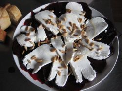 Das Schwarze ist in Wirklichkeit rot, nämlich im Ofen gebackene rote Bete (in meiner Sprache: rote Rüben). In Folie einwickeln, bei ca. 220 Grad (der Gatte dreht immer voll auf) ungefähr 90 Minuten ins Rohr. Dünn aufschneiden, Balsamico drüber, Ziegenfrischkäse (hier: Palet frais) drüber, ein bisschen Akazienhonig drüber, geröstete Pinienkerne oben drauf.