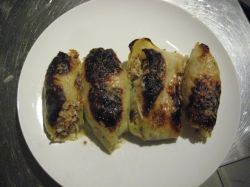 Das Schwarze soll übrigens so (oder wenigstens so ungefähr – die Kamera ist schuld), das ist der Parmesan, mit dem die Päckchen kurz vor Schluss gratiniert werden. Ich habe mich jedenfalls genau an Ottolenghis Zeitvorgaben gehalten.