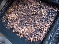 Aber es gab ja noch die zweite Hälfte der Mandeln. Auch sie wurden gehackt und unter ständigem Fluchen auf dem Backblech verteilt. (Die erste Ladung konnte leider nicht mehr gerettet werden. Wir dürfen auf der Terrasse nicht mit Kohle grillen.)