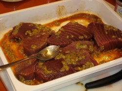 Während ich sie fluchend vom Pfannenboden stemme, kocht die Dämpfflüssigkeit im Topf nebenan so hoch, dass der Lachs plötzlich wieder schwimmen kann. Ich ziehe ihn gerade vom Feuer, als der Tunfisch in der Pfanne zu rauchen beginnt.